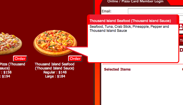 Still can’t make up your mind? Well, you can always check out the regular menu items like Land Ocean, beef, crab stick (everyone knows what a crab stick is, right?), corn, mushrooms, pepperoni and thousand island sauce.